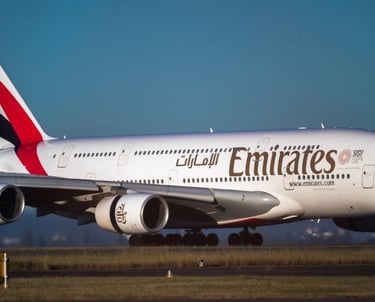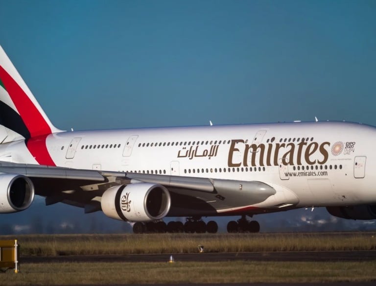 A vibrant photo of pilgrims boarding an Emirates airplane, ready for their spiritual journey.